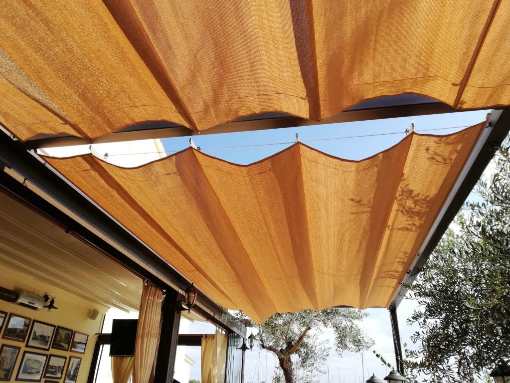Tend mesh raf pergola zaštita od sunca na postojećoj metalnoj konstrukciji, materijal otporan na sunce i vremenske uvjete poput jakog vjetra.